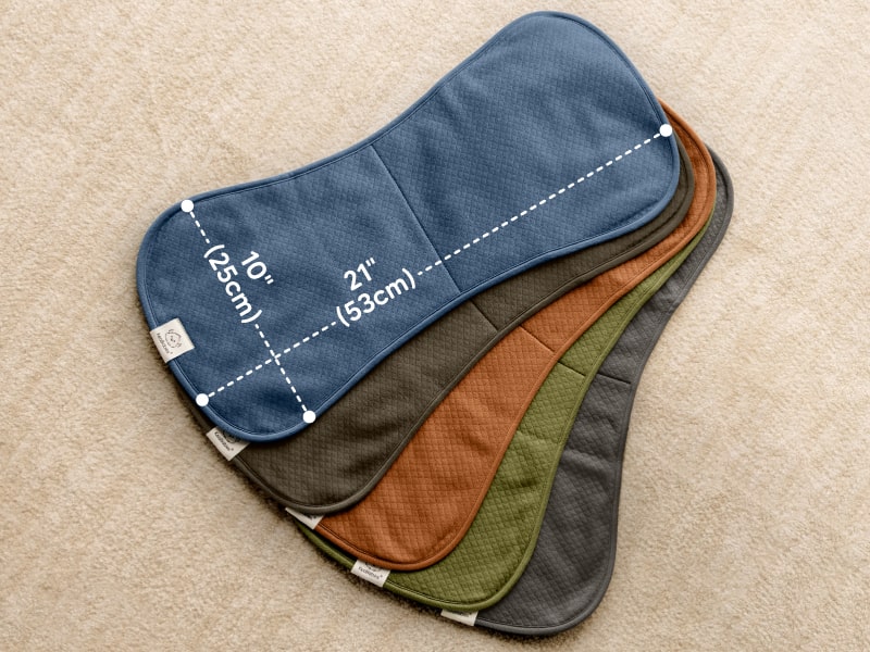 • Ergonomic burp cloth with a figure-8 design that stays snug for broad coverage