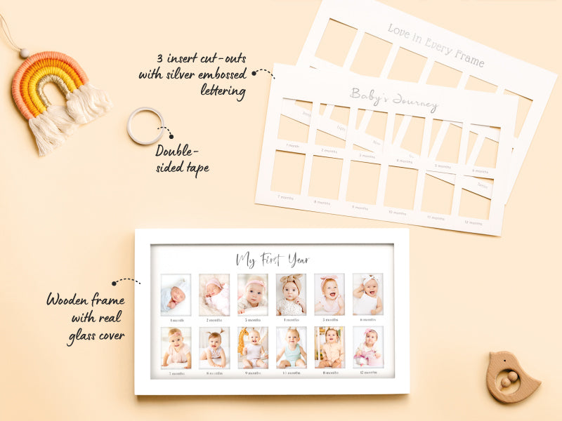Inside the Nova Baby's First Year Picture Frame, you'll find a 13" by 7.8" wooden frame with a real glass cover for a premium finish. It includes three inserts, each featuring different text and typography for a personalized touch. Double-sided tape is provided for easy photo placement, with each photo slot measuring 1.45" by 2".