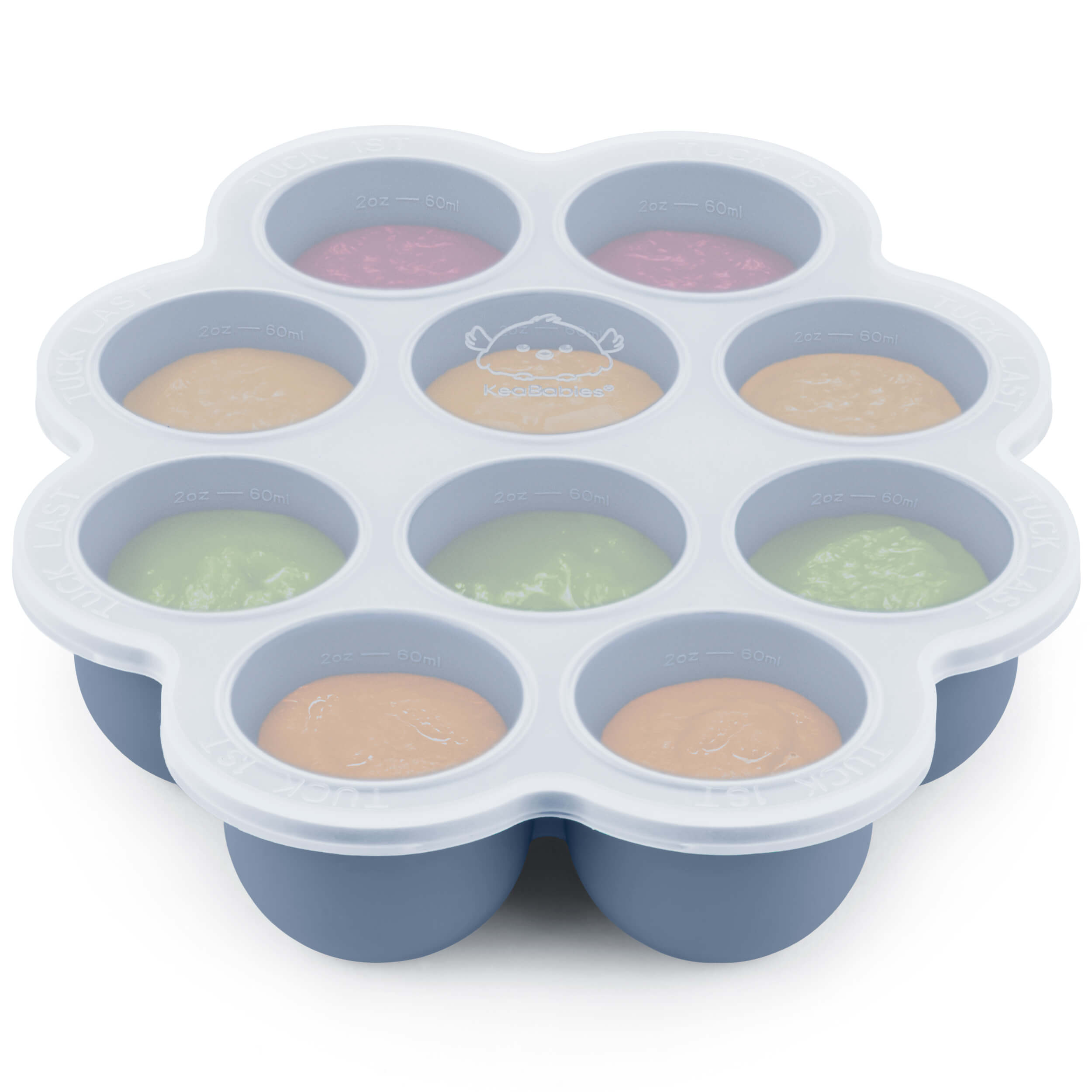 KeaBabies Prep Silicone Food Tray is easy to use and easy to clean. This product has 10 portions (1oz and 2oz marks in each pod) and made with 100% food grade silicone. The silicone is FDA & LFGB approved Food Grade Pure Silicone that is freezer, dishwasher, microwave, and oven safe. It also has a easy clip on clear silicone lid to keep food fresh.I highly recommend this product!