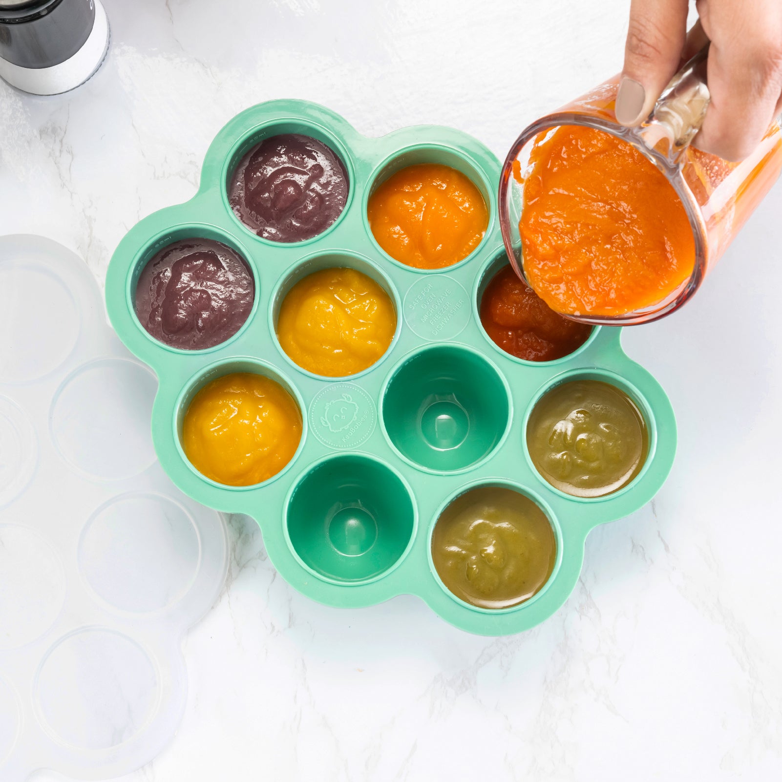 Now, this is a tray I can get behind! This tray has ten slots that can hold more than 2oz of food each. This is great when your baby is still eating in 2-4oz portions. Once they grow out of it, you can continue to use it for baking needs, storing leftovers, making ice, etc.The silicone is sturdy, and each tray has a 1oz/2oz marker. The only thing I dislike about this is the lid. Each corner has a flap to secure it into place. I don't have the patience to lock each one into place each time. By locking it in place, it seals so you can turn it outside down without fear of spills