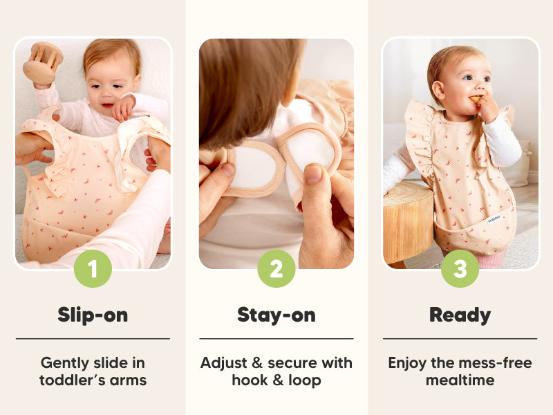 Designed in a soft smock style, this bib slips on easily, guided by gentle armholes that rest comfortably on little shoulders. The apron-like fit offers longer coverage, while an adjustable hook and loop closure at the back keeps it secure as your baby moves, reaches, and explores. Easy to wear, made to stay.