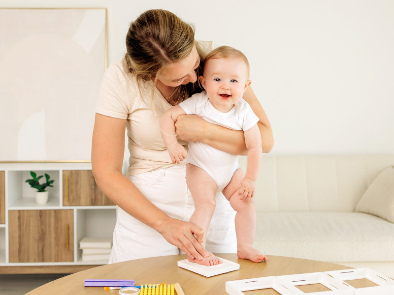 We’ve thought of it all! A tri-fold Fond wooden frame with glass, baby-safe air-dry clay, alphabet stamps for a personal touch, a wooden roller for smooth crafting, paint and brush for finishing touches, and double-sided tape to keep it all in place. Simple, fun, and ready to get crafty.
